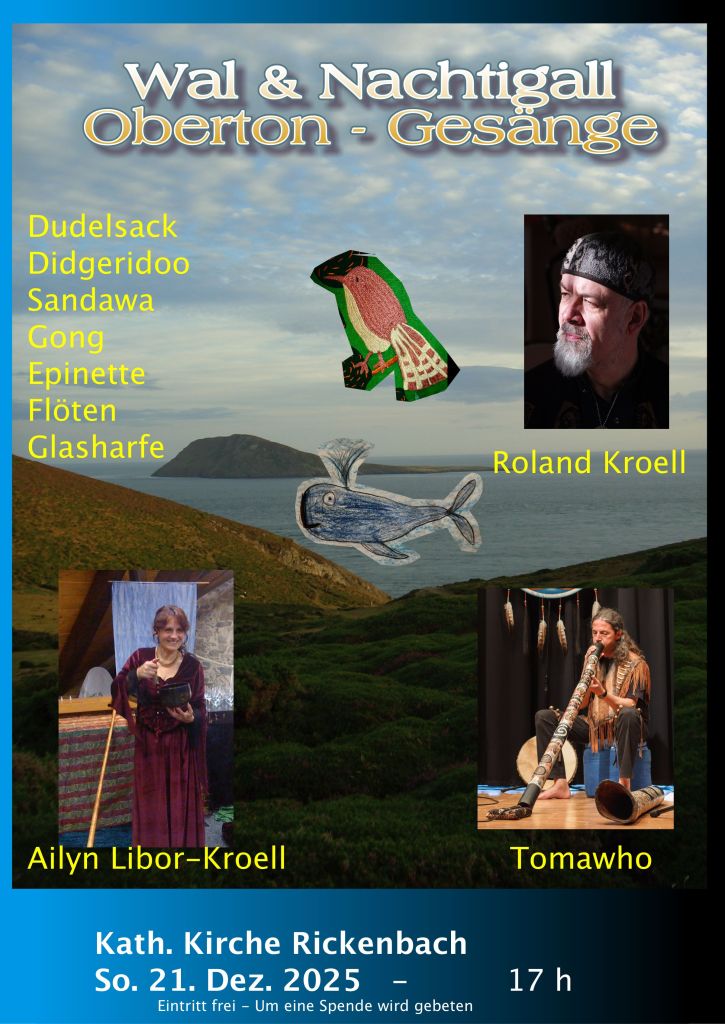 Wale sind die größten Lebewesen. Sie haben ein faszinierendes Kommunikationssystem. Besonders Blau- und Pottwale verständigen sich mit besonderen Tönen. Sie können über hunderte von Metern – oft sogar in einer Entfernung von 100 Kilometer noch von den anderen Walen gehört werden. Mit Dudelsack, Glasharfe, Gong, Epinette und Gesang mit Obertönen von Roland Kroell und begleitet von Michael Rudigier (Tomawho) mit Didgeridoo`s, Oceandrum, Indianerflöten & Duduk, sowie von Claudia-Ailyn Libor-Kroell mit Monochord, Wassertrommel, Tanbura & Flöte, versuchen die Musiker sich in die Wale und eine Nachtigall hineinzuversetzen. Beide Tiere sind Meister des Gesanges. Die Idee kam von Thomas Lehner, einem Freund der Musiker, der ein Libretto für eine Waloper geschrieben hat, das im nächsten Jahr 2026 auch als Buch erscheint.
